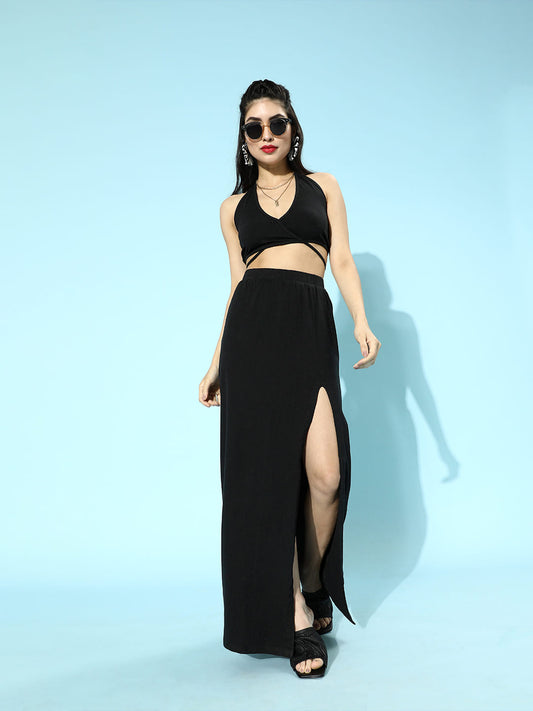 SCORPIUS Black Backless Coord Set with a slit Skirt