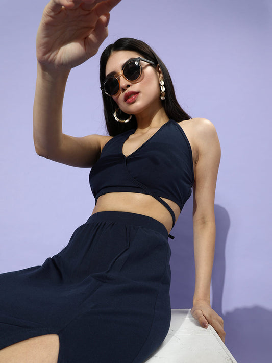 SCORPIUS Navy Backless Coord Set with a slit Skirt