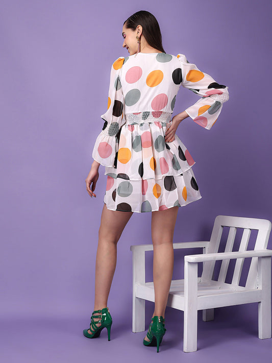 SCORPIUS Polka Dots Printed Smocked Georgette Fit Flare Mini Dress