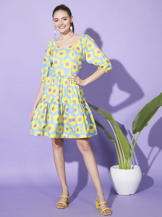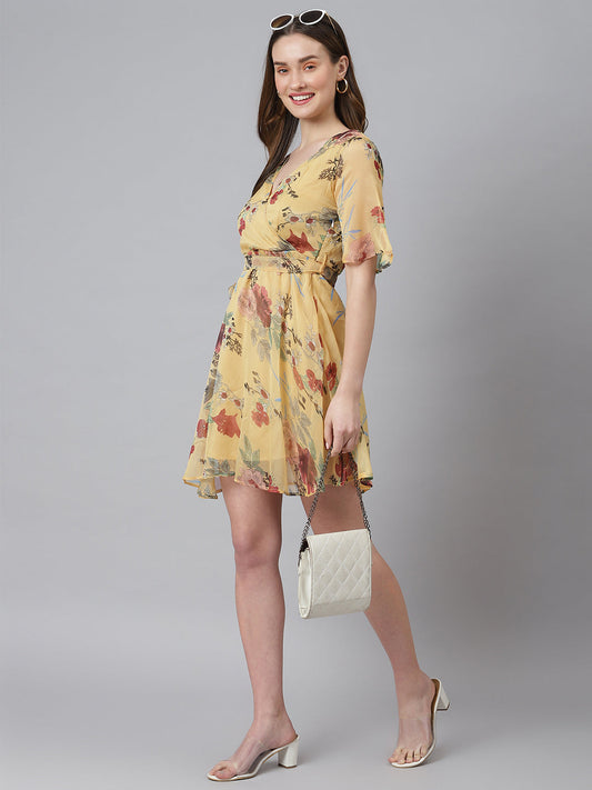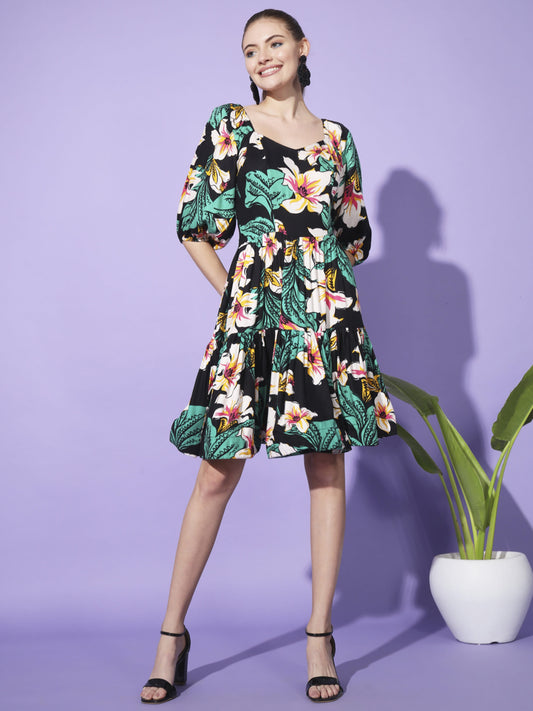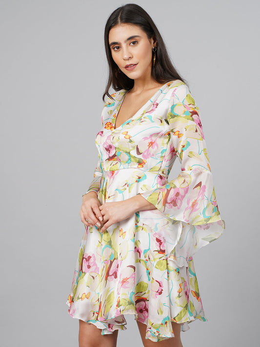 SCORPIUS Floral Printed Bell Sleeve Chiffon Layered Fit Flare Dress