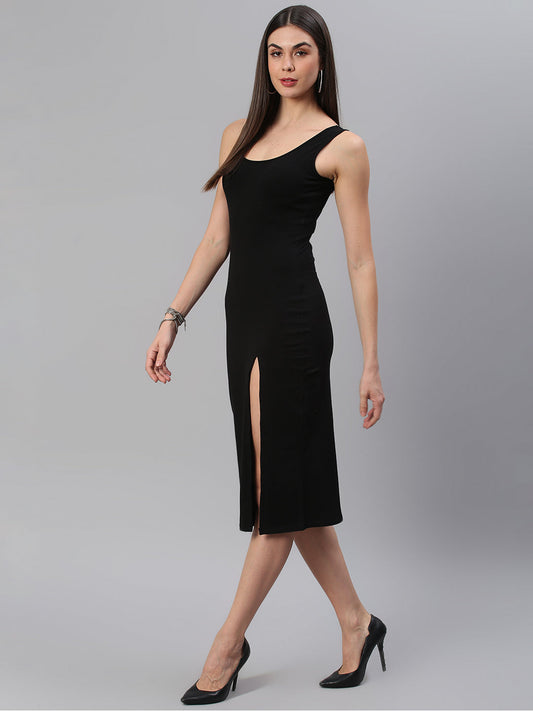 Front Slit Solid Black Dress