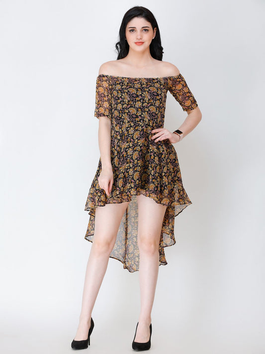 SCORPIUS BLACK PRINTED OFFSHOULDER DRESS