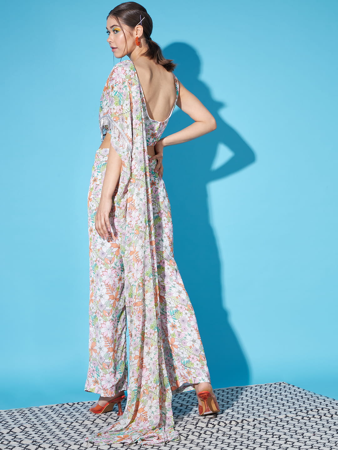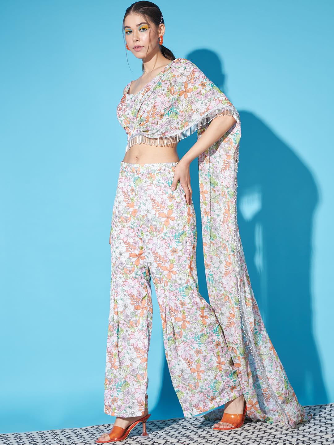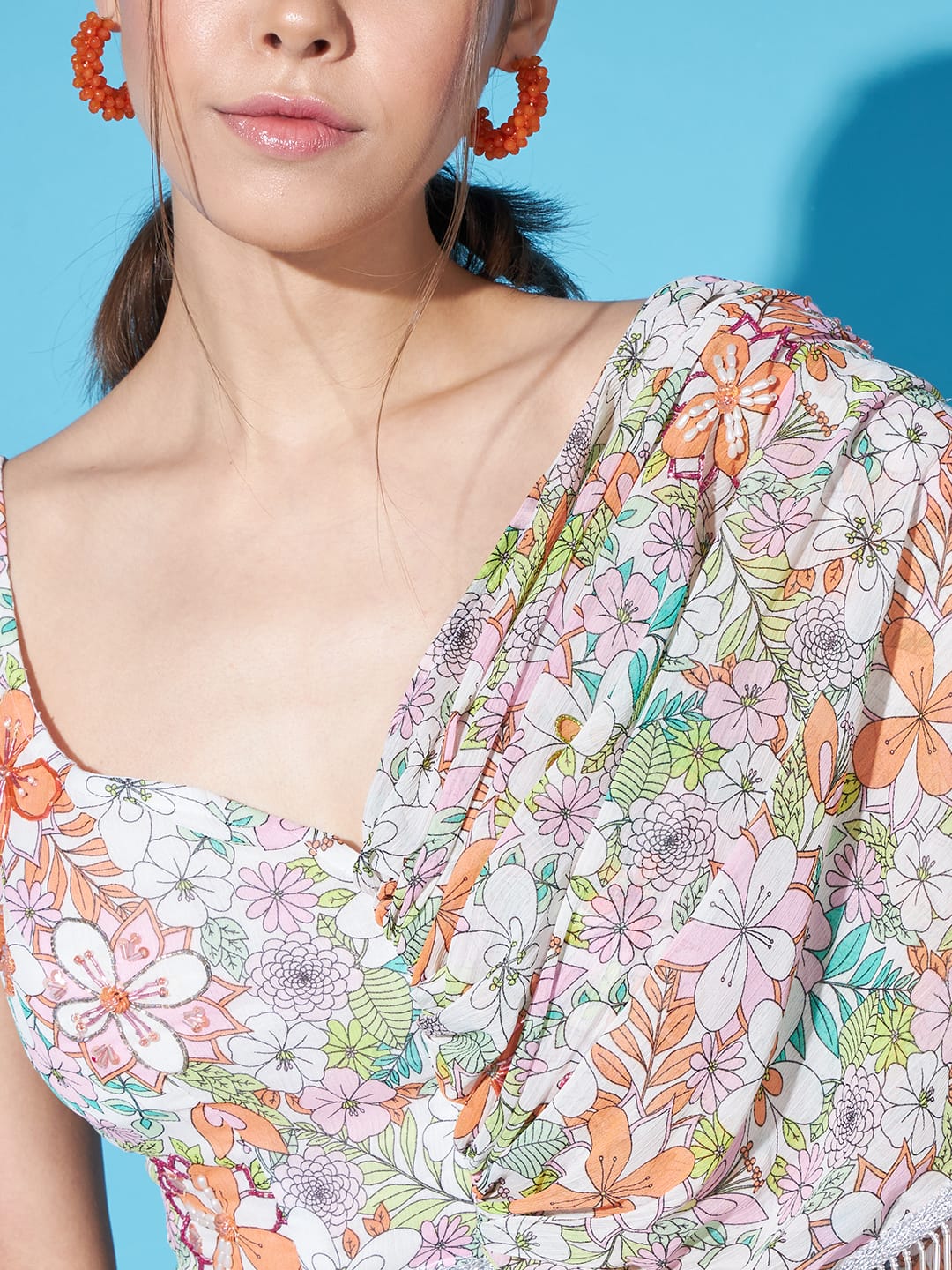 Ethereal Blooms: White Floral Fusion Coord Set in Drape Style | Hues of India